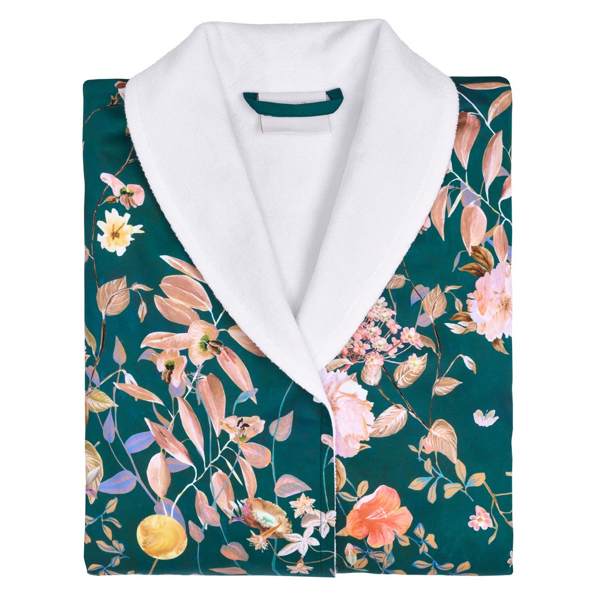 Luxuriöser Morgenmantel Fantasia: handgemalte Blumen auf 100% Baumwoll-Satin – Christian Fischbacher bringt Kunst ins Schlafzimmer.