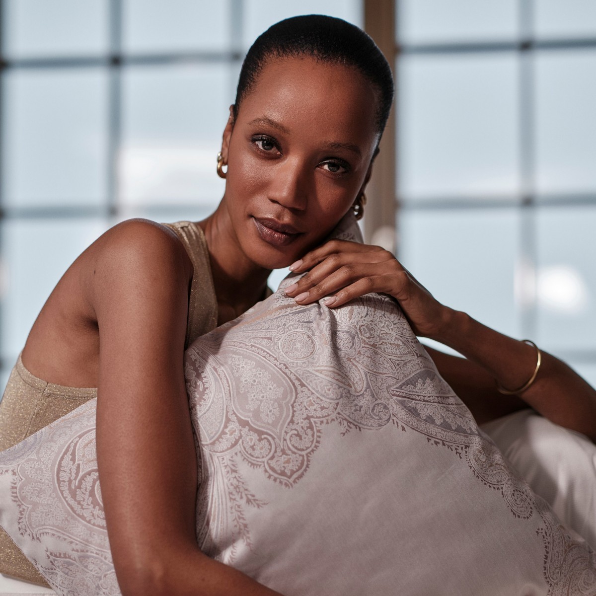 Son somptueux motif cachemire est fabriqué en Italie dans l’une des plus prestigieuses manufactures, dans des nuances subtiles d’or, d’argent et de rose poudré. L’entrelacement raffiné des fils de chaîne et de trame crée une profondeur visuelle unique et un éclat luxueux.