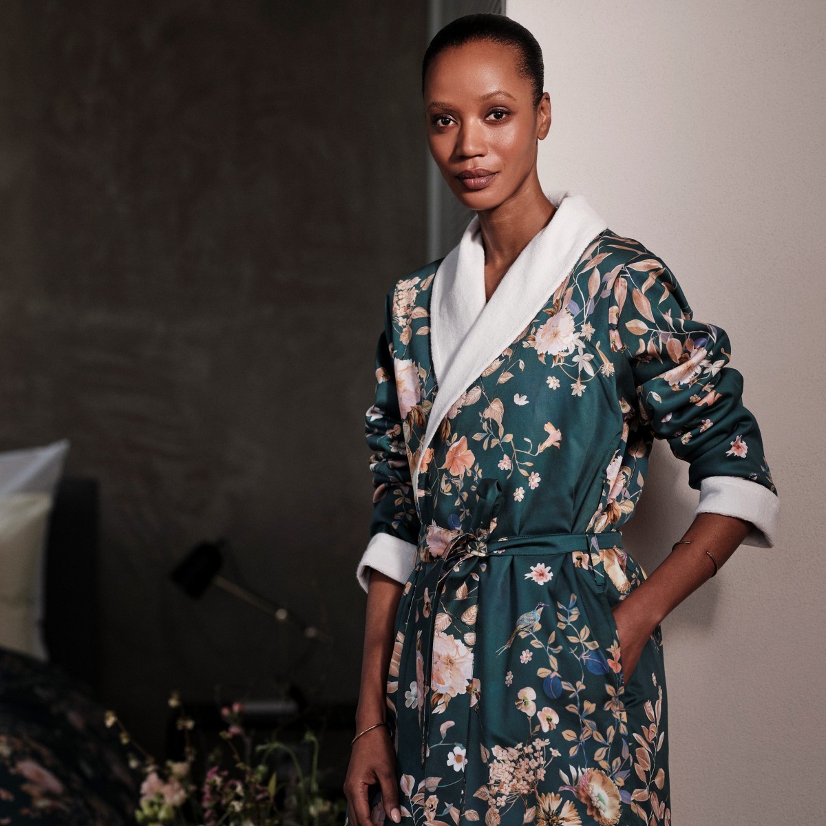 Le peignoir Satin Fantasia de Christian Fischbacher allie confort somptueux et art floral raffiné.