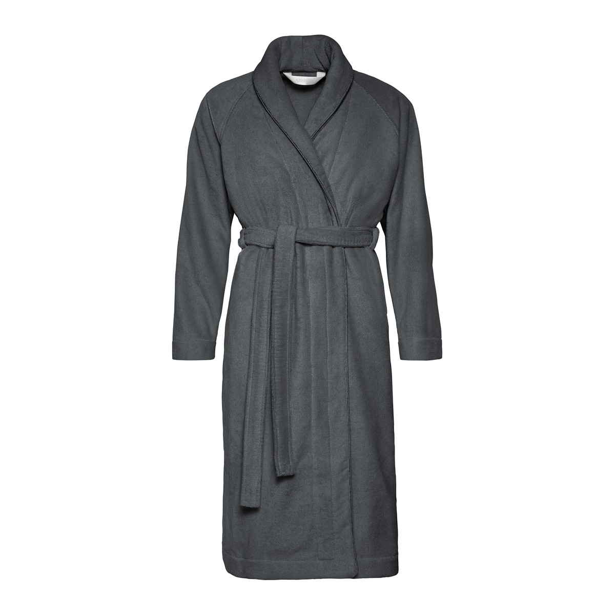 Accappatoio Coshmere di Schlossberg in 100% cotone bio pettinato GOTS, con sciallatura, cintura e tasche. Disponibile in Blanc o Ombre, XS–XXL. Unisex.