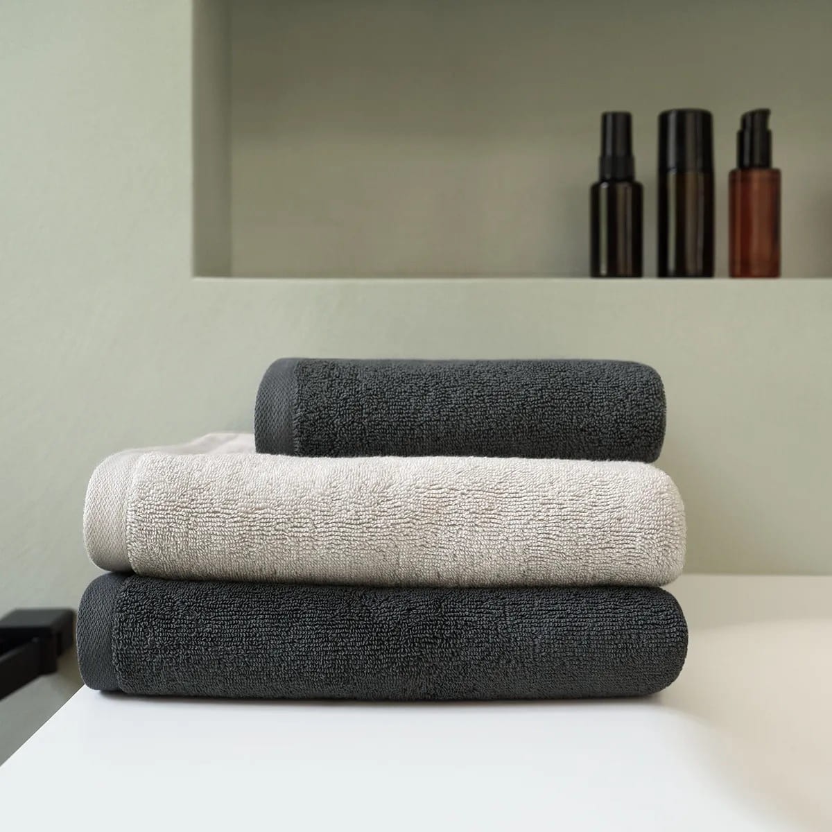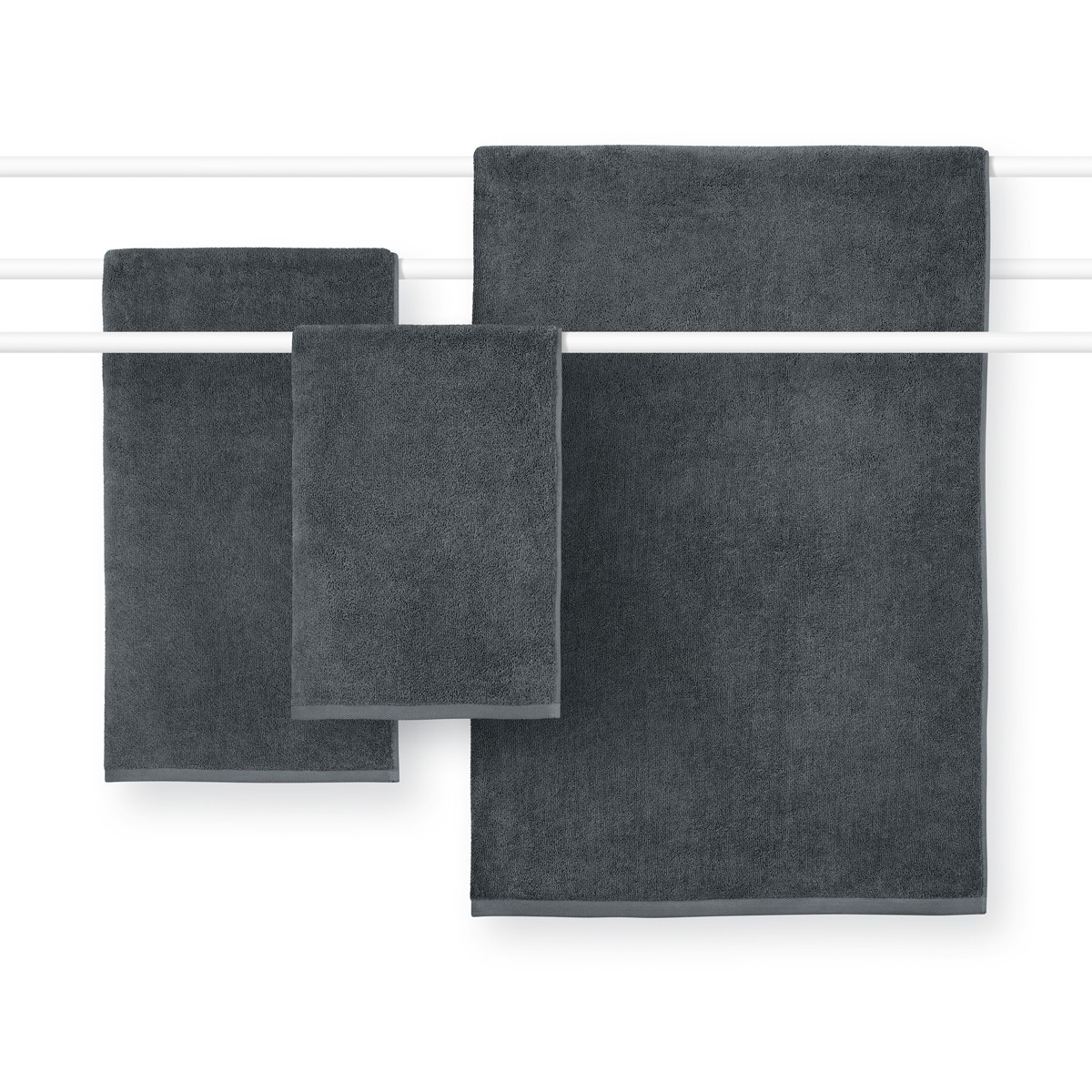 La gamma comprende sei tipologie: panno per il viso 30x30cm, asciugamano per ospiti 40x65cm, asciugamano 50x100cm, telo doccia 70x140cm, telo bagno 100x150cm, tappetino doccia 50x80cm. Gli asciugamani hanno un peso di 550 g/m², mentre il tappeto da doccia raggiunge 1’000 g/m², per una maggiore morbidezza e stabilità sotto i piedi.