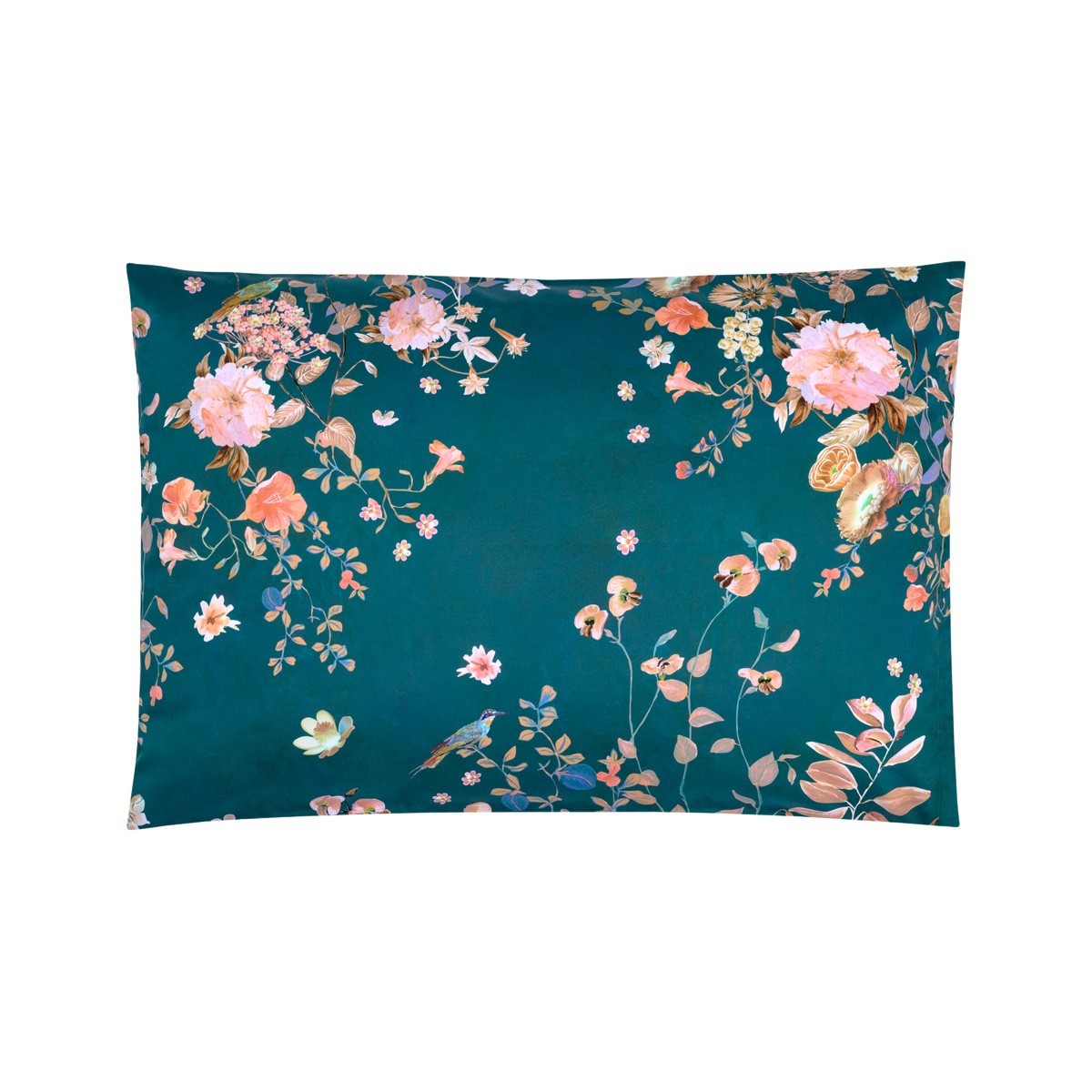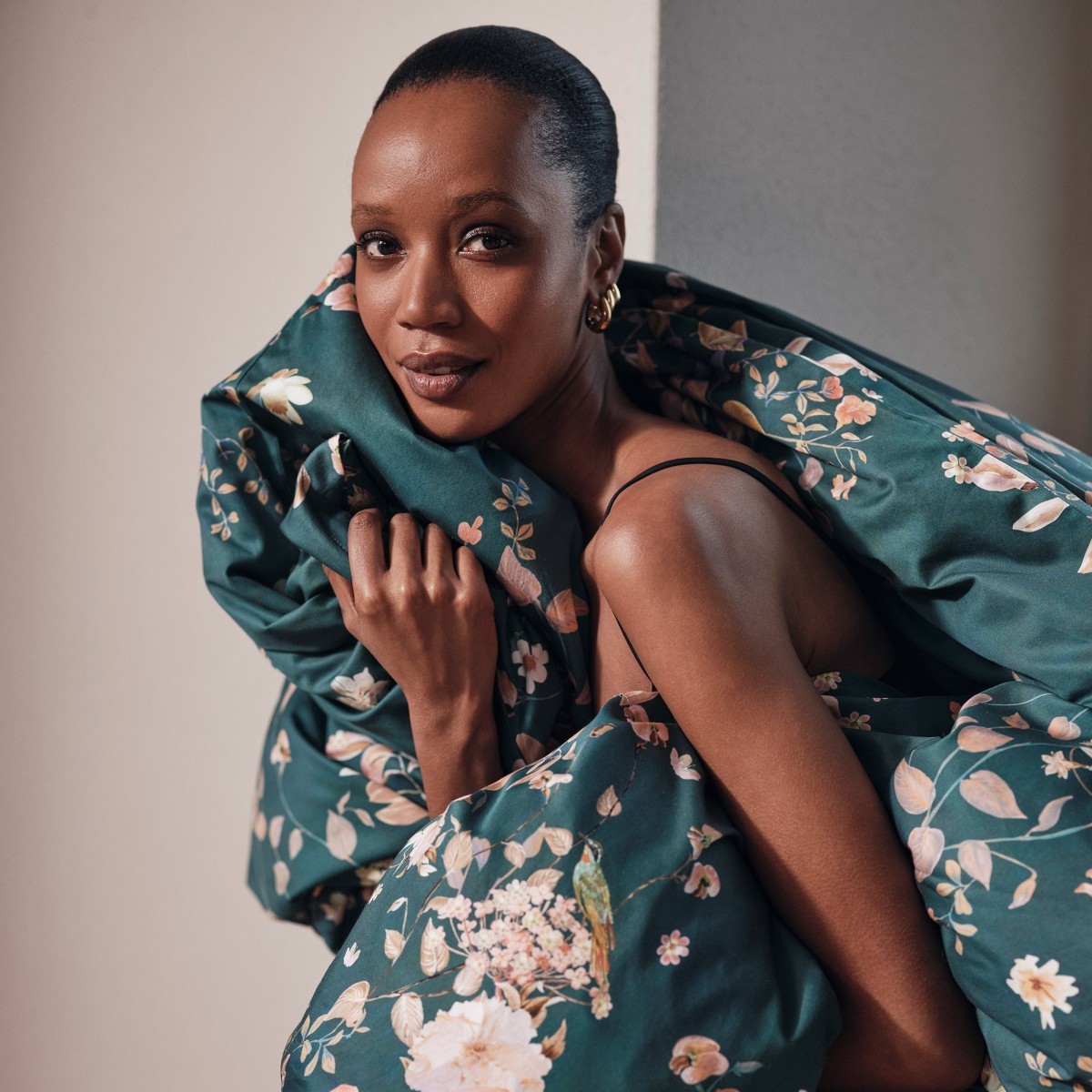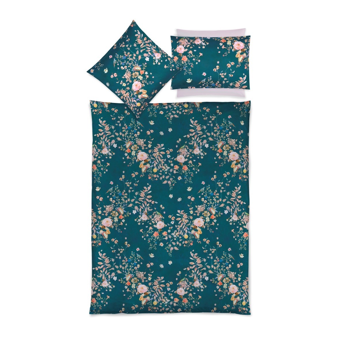 Fantasia di Christian Fischbacher: un mondo esotico e floreale su raso satin, per un tocco di magia in camera da letto.
