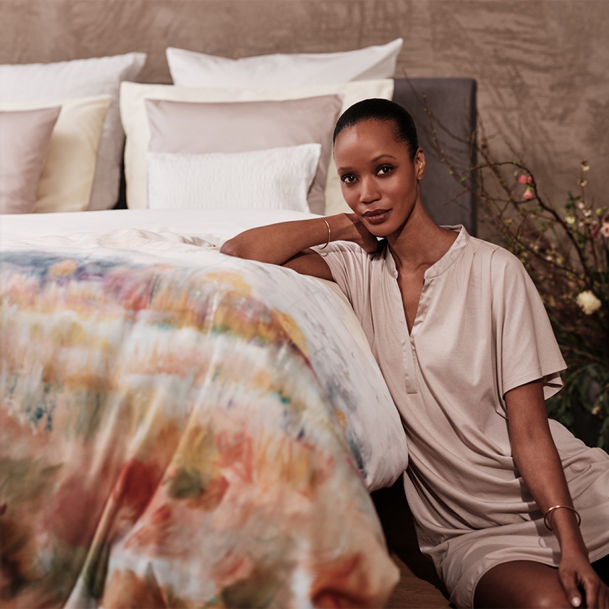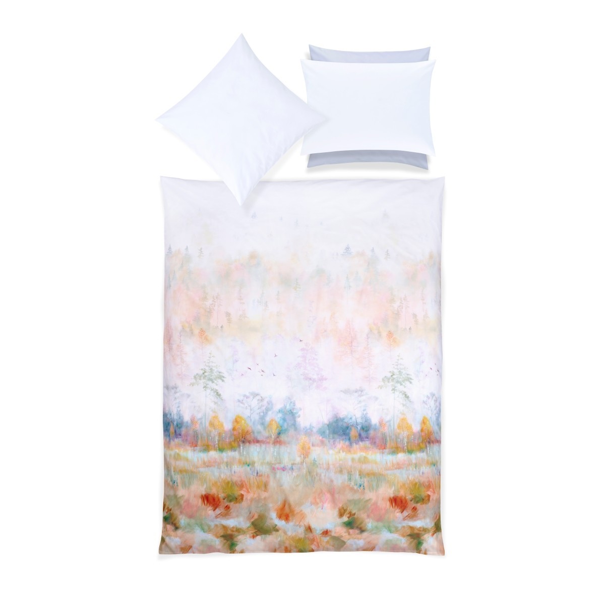 Aurum di Christian Fischbacher: paesaggi autunnali e nebbie su raso di cotone – un tocco poetico e raffinato per la tua camera.