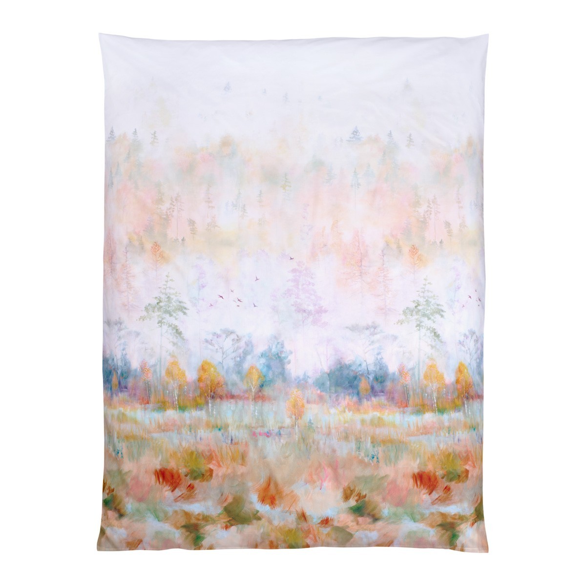 Toni ocra, rossi e verdi colorano alberi ed erbe, mentre lievi veli di nebbia fluttuano tra le cime, donando un tocco di leggerezza e magia. Questa scena autunnale, dipinta a mano nell’atelier della maison, è stata stampata in Nord Italia sul raffinato raso di cotone. Aurum unisce l’eleganza artistica e il comfort del miglior tessuto, trasformando la tua camera in un’oasi di calma e armonia.