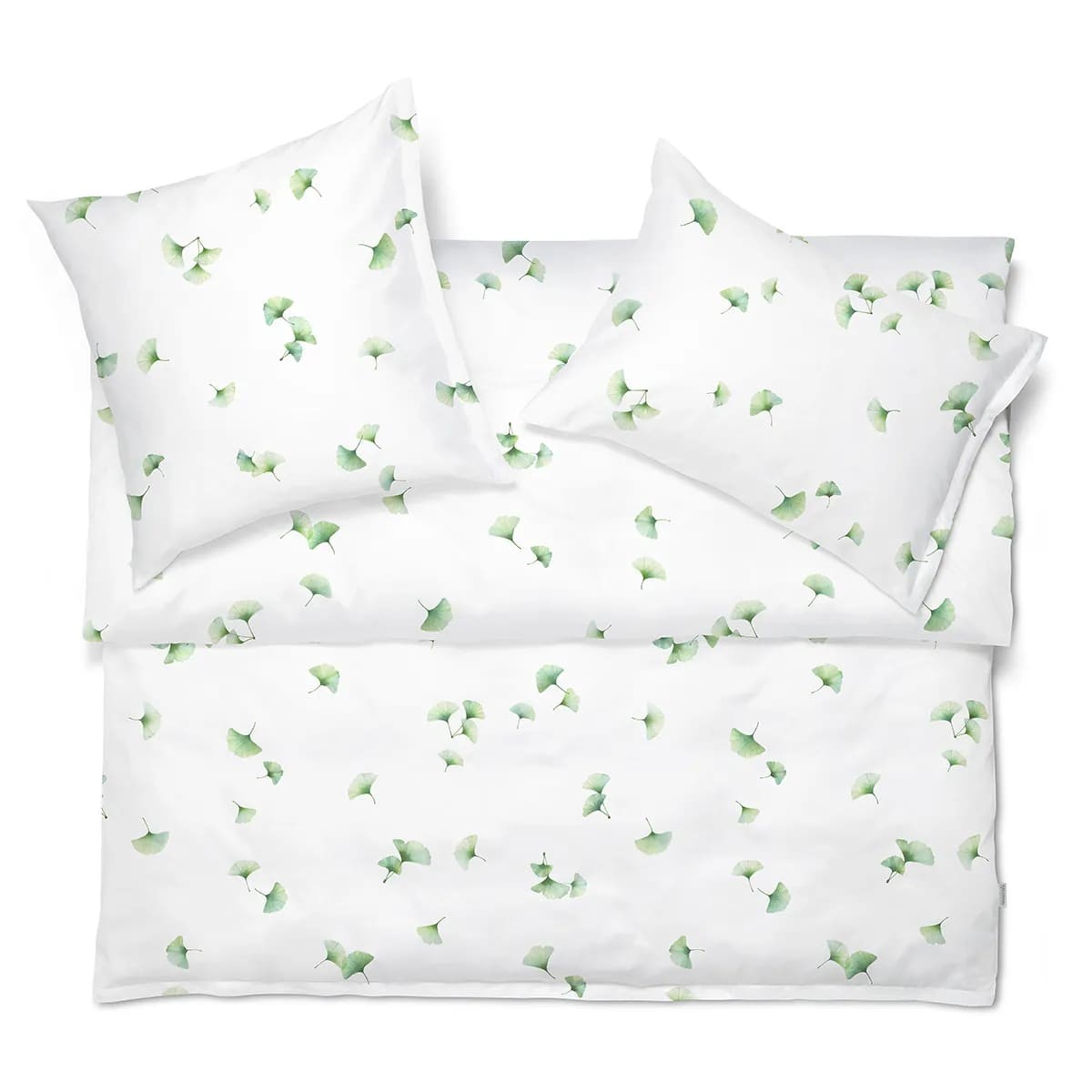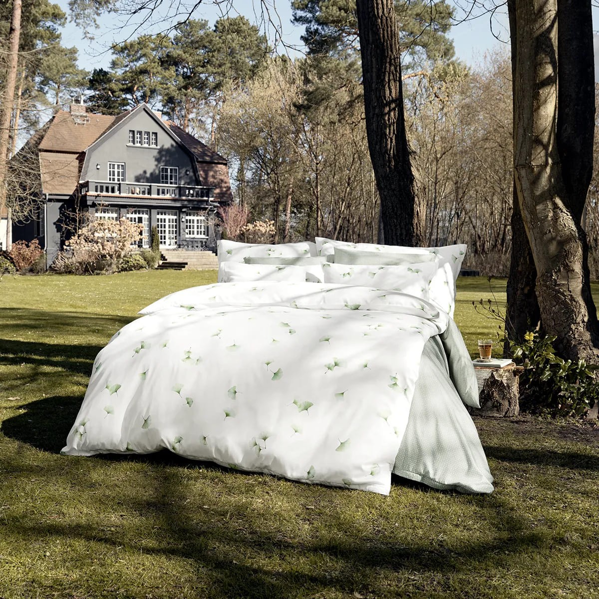 Con Aiko, Schlossberg porta un senso di serenità raffinata nella camera da letto. Su un fondo bianco puro in satin di cotone (ca. 110 g/m²), si posano leggere foglie di ginkgo, come sospinte da una brezza estiva. Il motivo è realizzato con una delicata tecnica ad acquerello, che conferisce trasparenze sottili e un effetto pittorico unico. Le sfumature di verde – dal più tenue al più intenso – si mescolano armoniosamente, dando vita a un paesaggio naturale astratto e rilassante. Ogni foglia è arricchita da dettagli precisi, come le nervature visibili e i bordi morbidi, che conferiscono profondità e autenticità al disegno.