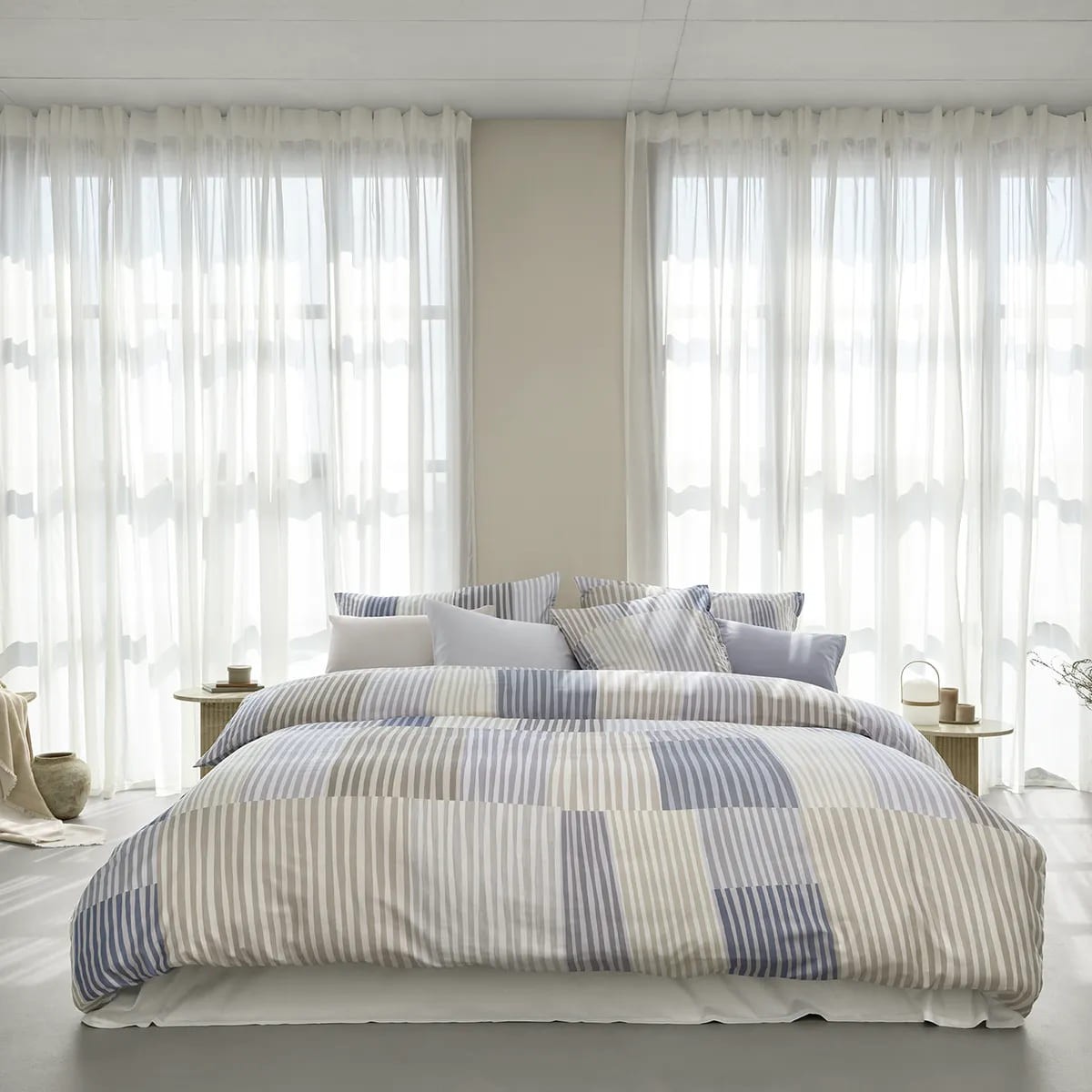 Melvin di Schlossberg: righe dipinte a pennello su satin di cotone in beige o multicolor. Un ritmo visivo fatto di contrasti, colore e movimento.