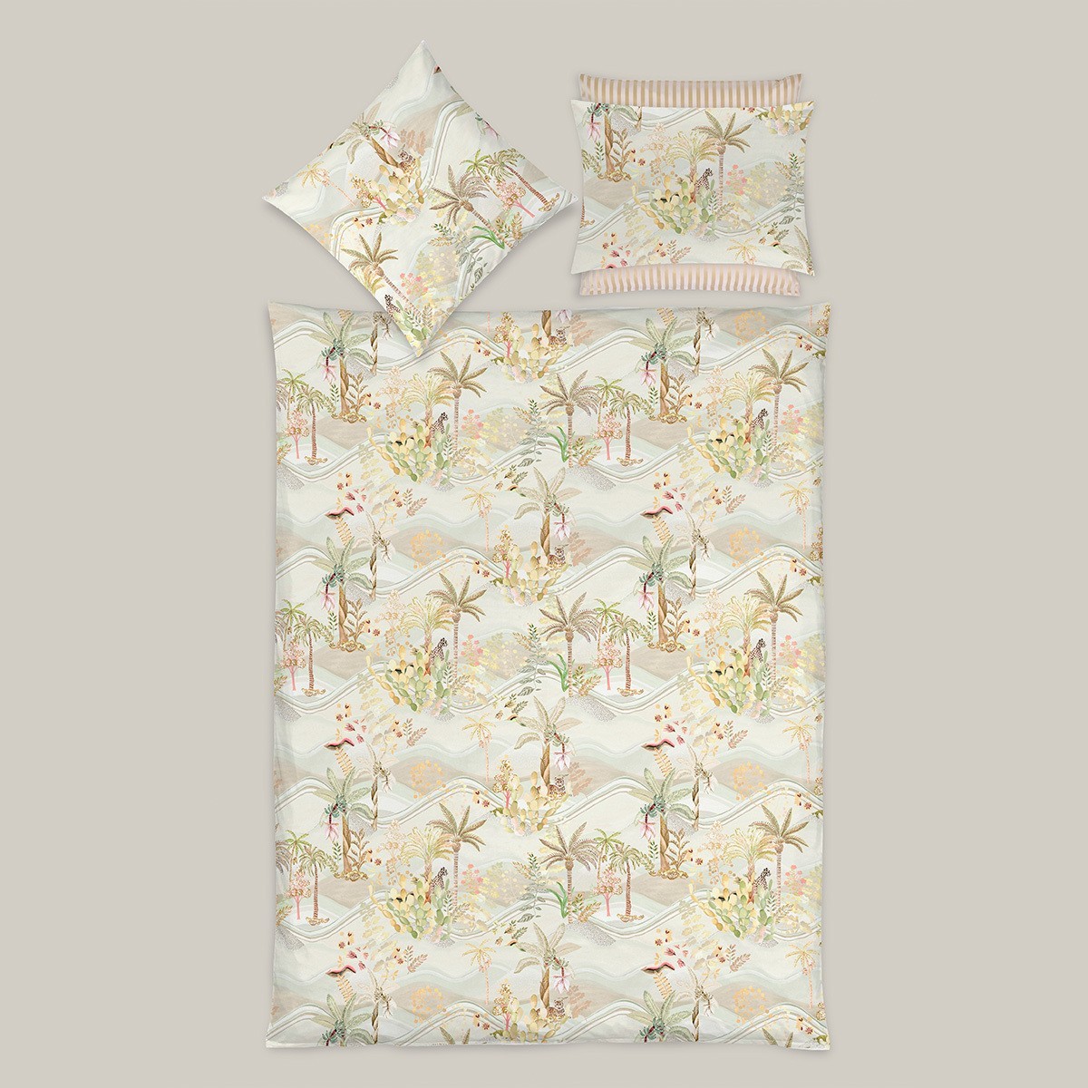 Oasis di Christian Fischbacher: palme, tigre e tonalità sabbia per una biancheria da letto elegante e rilassante in satin di qualità.