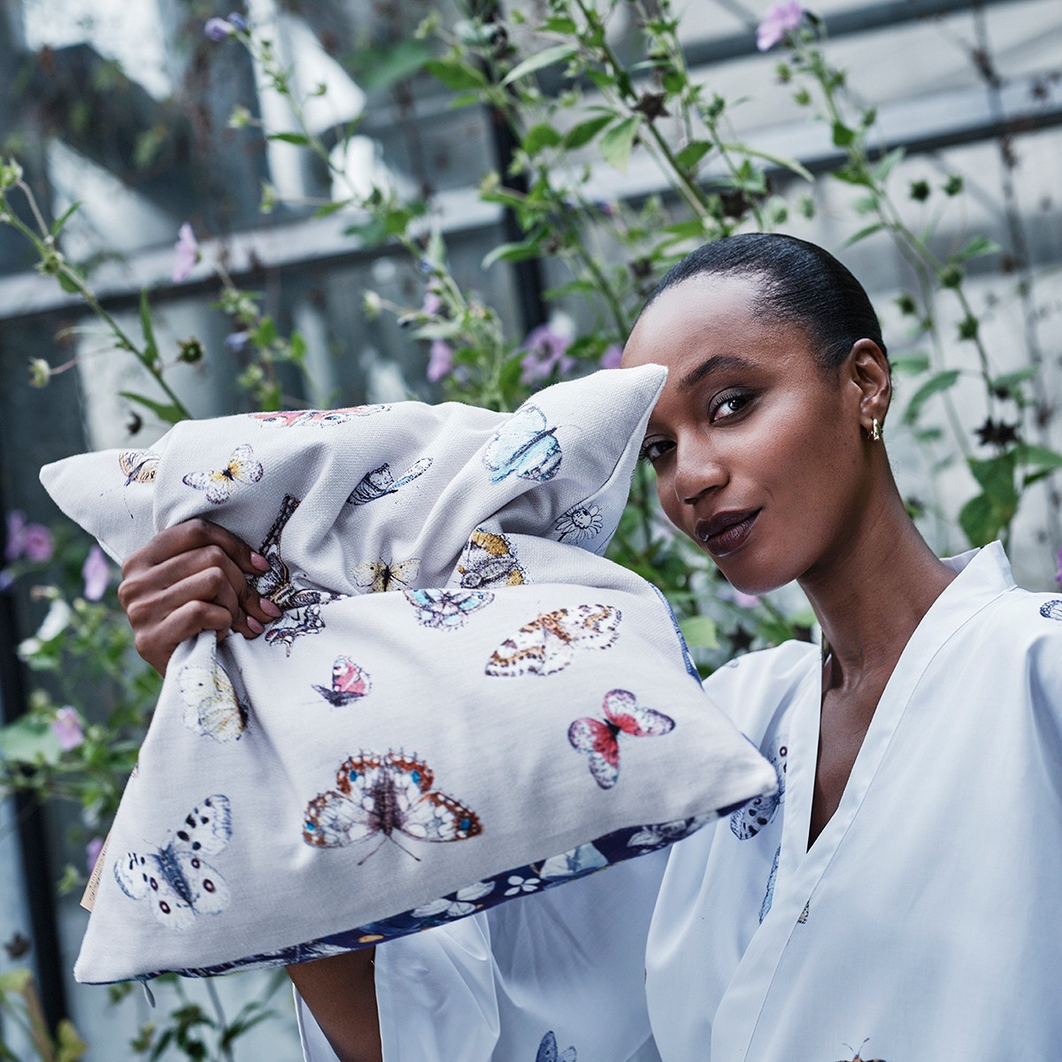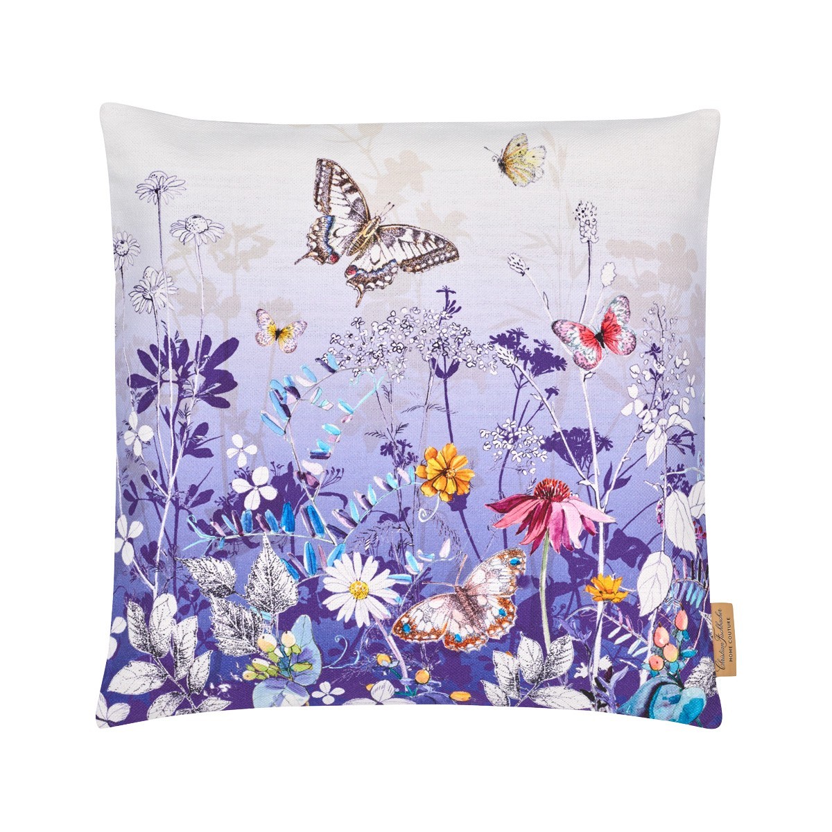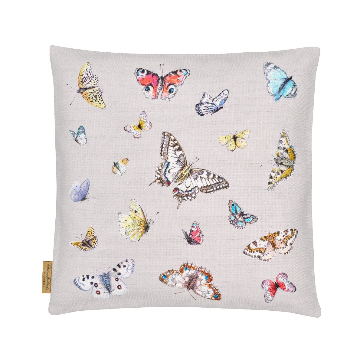 Cuscino Canvas Aviva di Christian Fischbacher: farfalle e fiori delicati in 100% cotone per un tocco elegante e naturale nei tuoi ambienti.