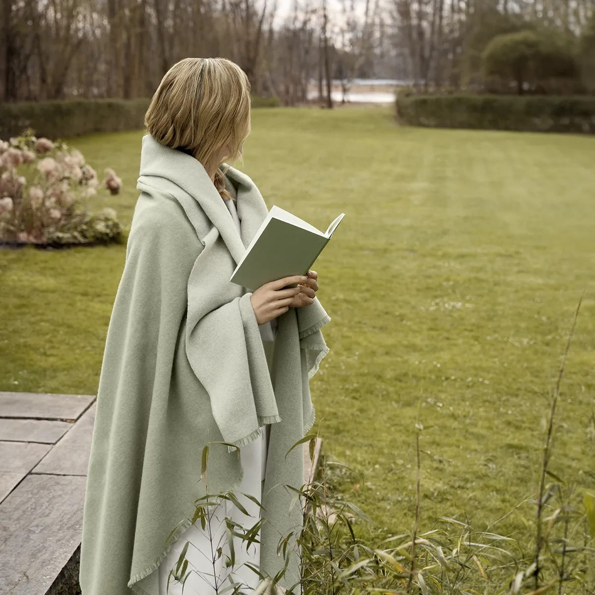 Plaid Dina di Schlossberg, 90% lana e 10% cashmere. Morbidezza e calore avvolgente in beige o green. Misura 130x200 cm.