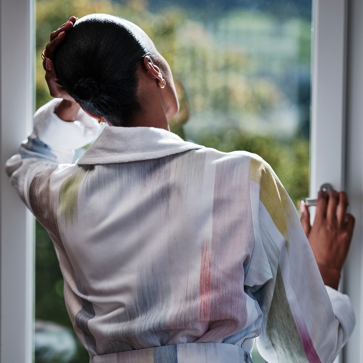 Il design Motion si distingue per i suoi pattern fluidi e vitali, ispirati a forme organiche e movimenti delicati. Le linee morbide e le sfumature armoniose creano una superficie tessile contemporanea e raffinata, trasformando la vestaglia in un capo non solo funzionale, ma anche esteticamente ricercato. La stampa, realizzata con grande precisione, valorizza la brillantezza del satin e offre un effetto visivo elegante e moderno.