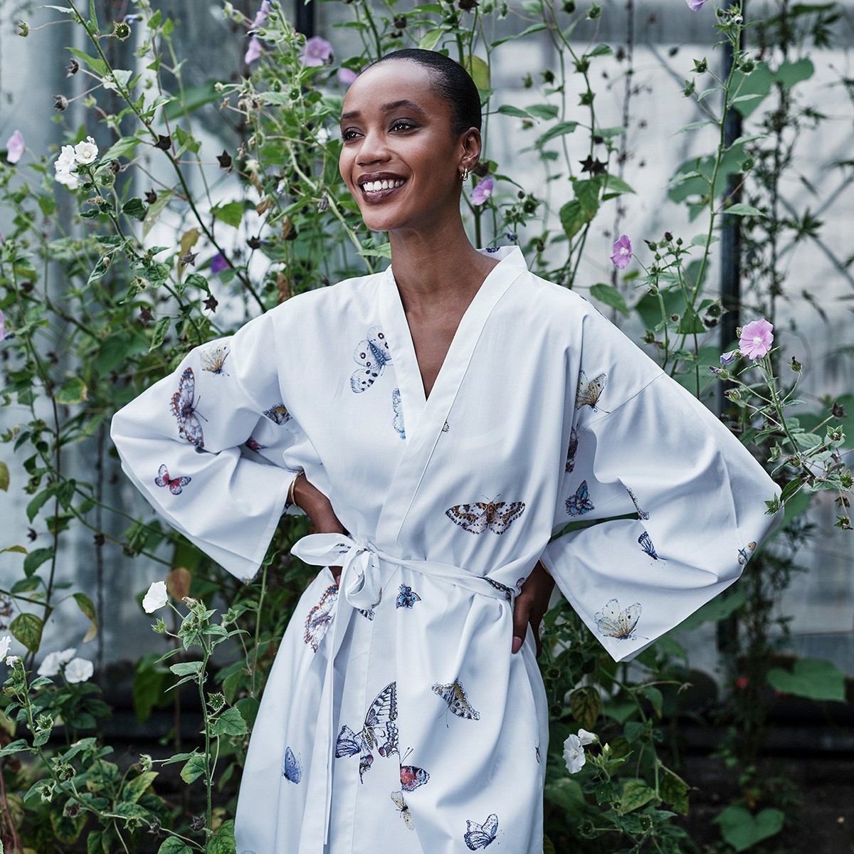 Kimono Vanessa in cotone satinato di Christian Fischbacher: farfalle eleganti, comfort e stile raffinato per momenti di relax chic.